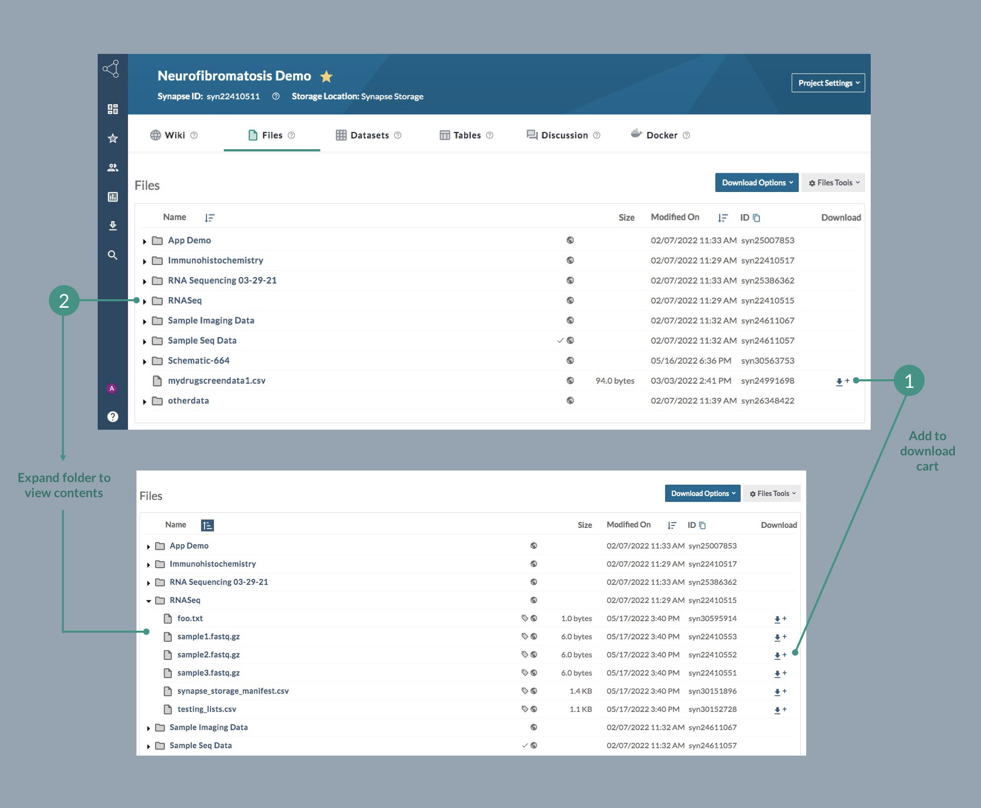 Within the project, you may see a series of folders. Any standalone files are downloadable using the down arrow icon in the Download column for that file (1). You can click the > arrow next to any folder to expand it and view its files within (2). To download any individual file from here, click the download icon in the Download column for that file (1), which will add that file to your download cart.