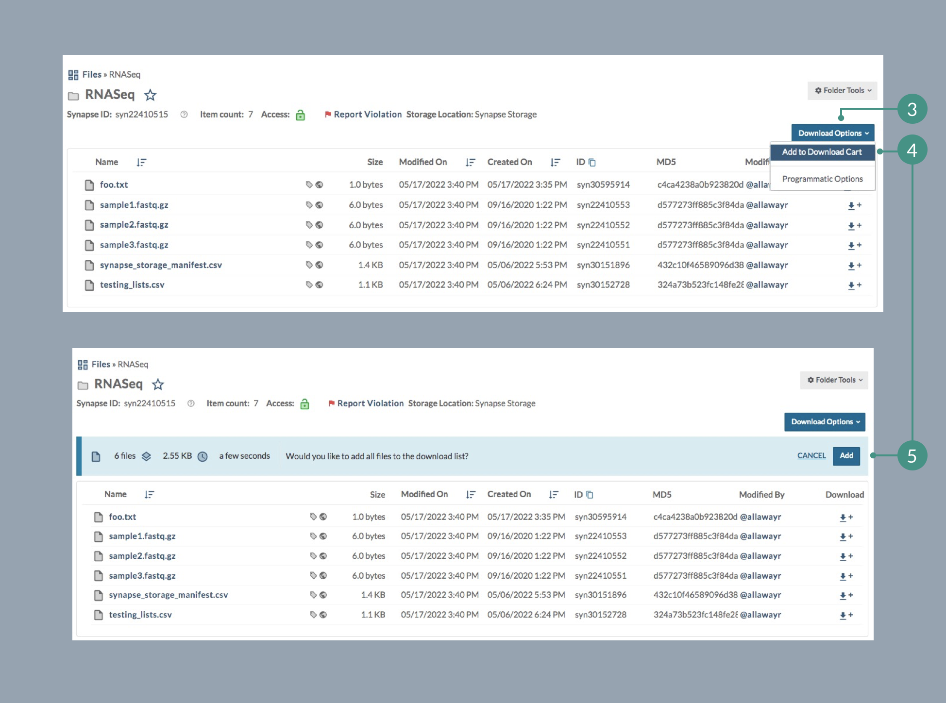 Alternatively, if you want to download every file within a folder, you can do so more efficiently. Click on the name of the folder (instead of just expanding it). On this new page with just that folder and its contents, click Download Options (3) followed by Add to Download Cart (4). You’ll be notified of the number and size of files, and asked if you wish to proceed—click Add (5).