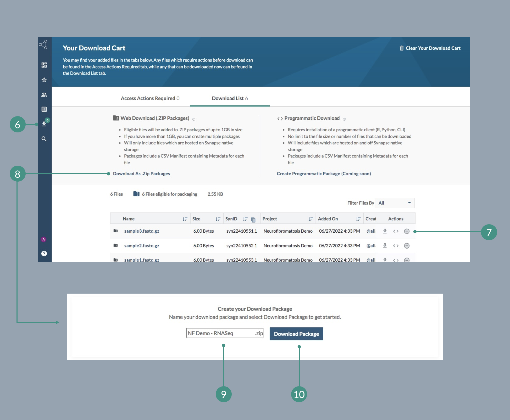 As you add items to your download cart, notice that this gets reflected in the Downloads icon of your Synapse toolbar on the left (6). Click this icon once you are ready to download all files in your cart (at this point, they are not downloaded to your computer yet).