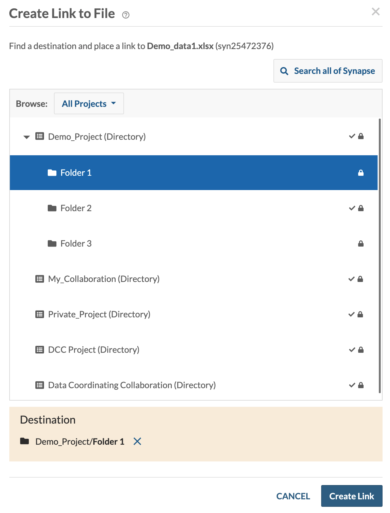 Synapse links are shortcuts to other data in Synapse. You can use links to create bookmarks for any file, table, view, folder, or project, rather than duplicating them in multiple folders. Links receive their own synIDs that are unique from the original linked item.