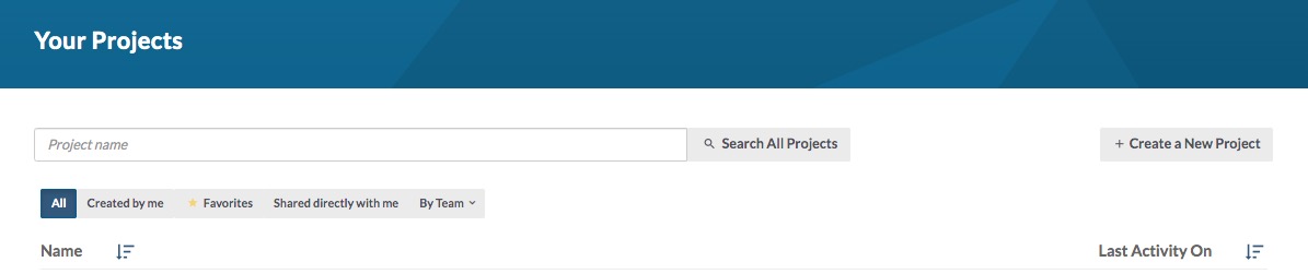 Your main point of entry into Synapse activity will likely be your dashboard. This is where all of “your projects” will live, including projects that you have created, projects you have favorited, and projects that have been shared with you. Your dashboard is also the page from which you can create a new project.