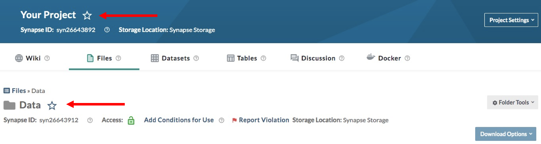 Throughout Synapse, you can favorite pretty much any item (project, file, folder, table, dataset, etc.) by clicking the star icon next to its name. This will add that item to your favorites list.