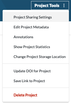To view and modify sharing settings on a project, go to that project and click Project Settings in the top right corner, and select Project Sharing Settings from the resulting dropdown menu.