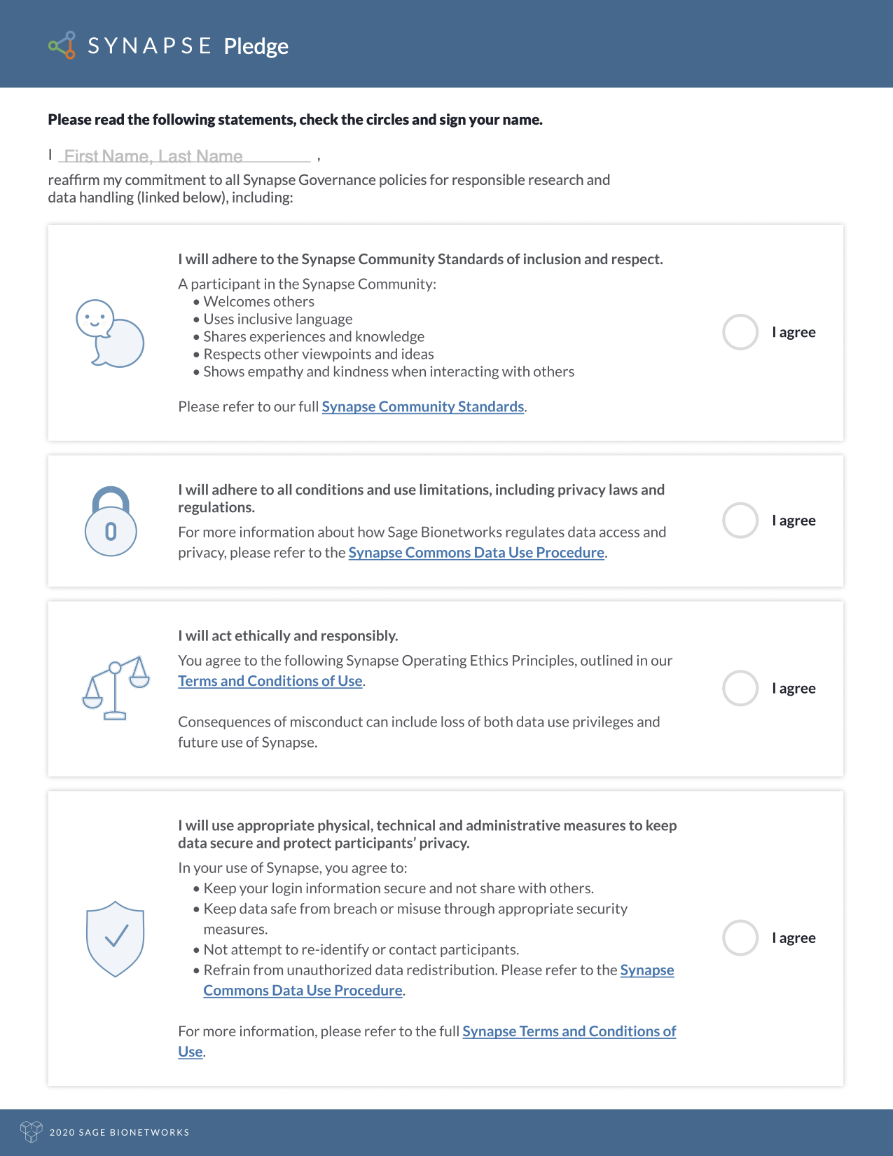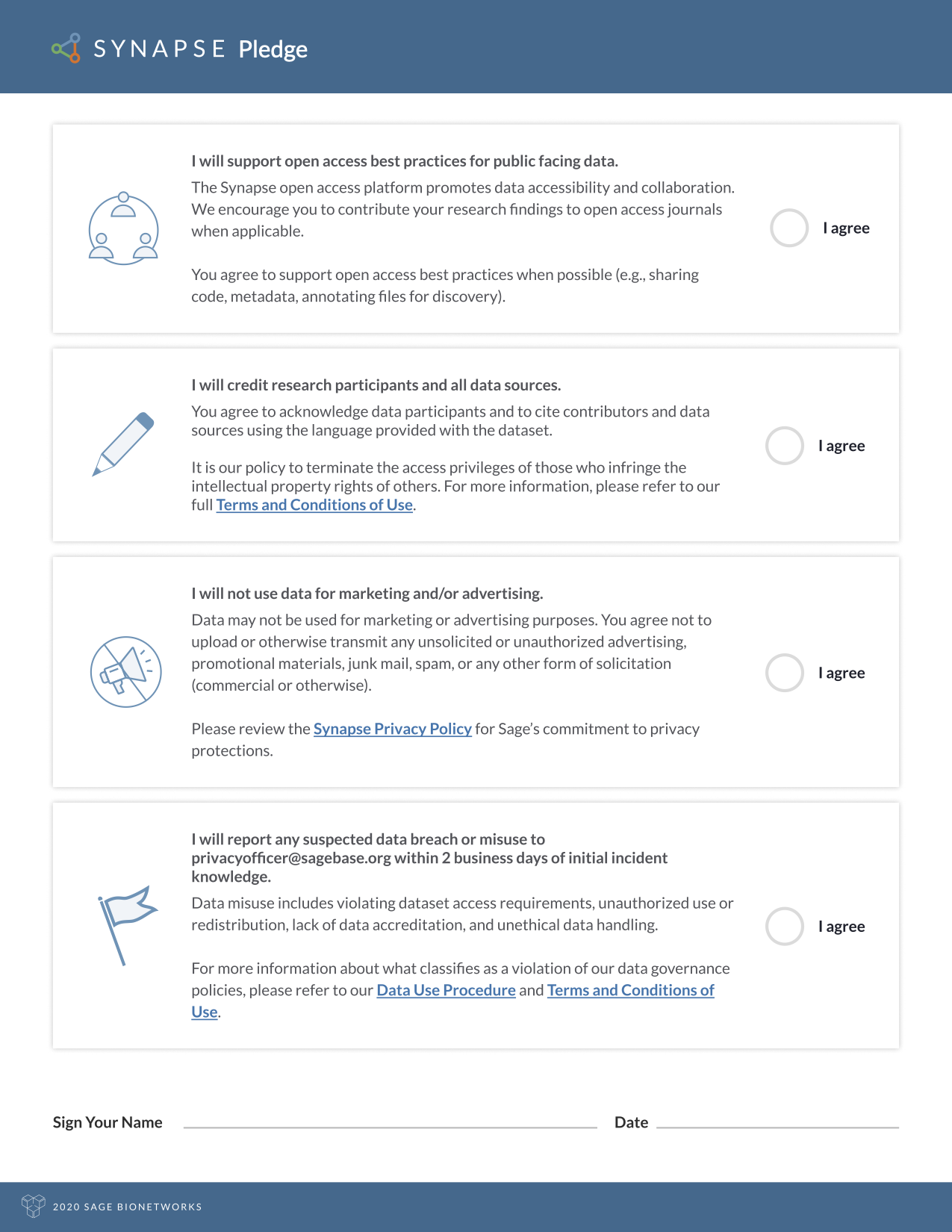 Use the link below to download the Synapse Pledge. Once you read the Pledge carefully, add your name, signature, and date. Upload a copy to the Profile Validation section of your Synapse profile.